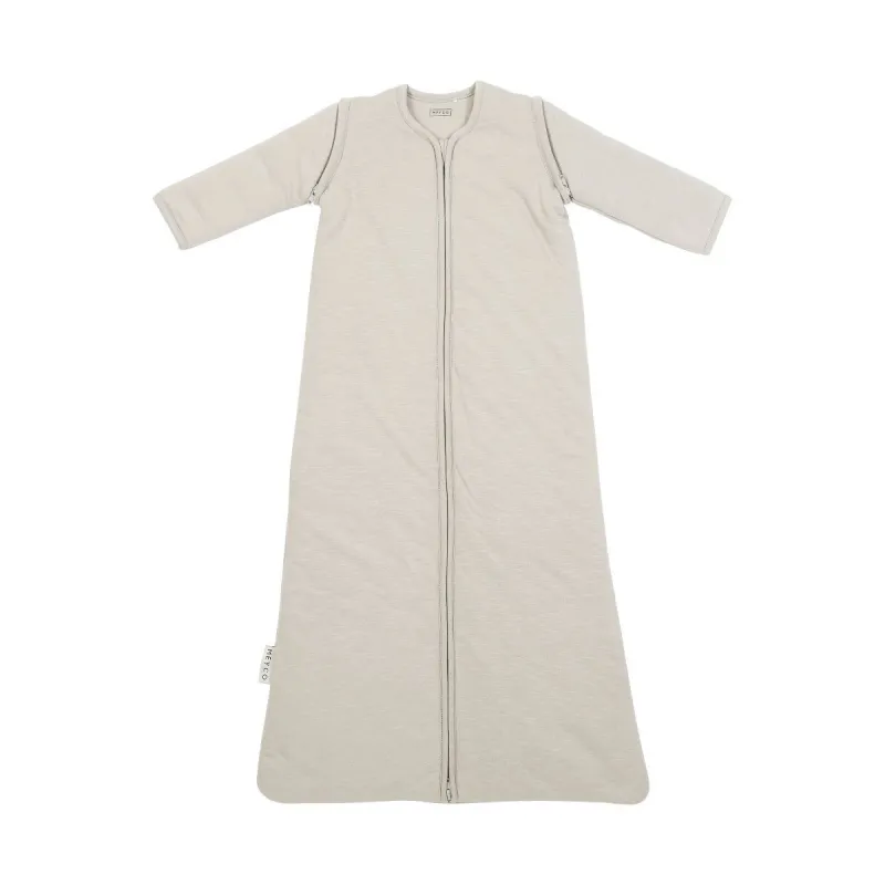 El saco de dormir está disponible en las siguientes tallas: 60 cm para usar de 0 a 4 meses aproximadamente y una longitud de 50 a 65 cm. 70 cm para usar de 3 a 9 meses y una longitud de 60 a 75 cm. 90 cm para uso de 6 a 30 meses aproximadamente y una longitud de 70 a 95 cm. 110 cm para utilizar a partir de los 24 meses aproximadamente y una longitud de 90 a 115 cm. La longitud de tu hijo es más importante que la edad para determinar la talla adecuada del saco de dormir. Si el saco de dormir es demasiado grande, tu bebé puede hundirse. Nunca utilices un saco de dormir si la cabeza de tu pequeño cabe por la abertura del cuello. En un saco de dormir para bebés demasiado pequeño, tu hijo no podrá estirar completamente las piernas ni tendrá espacio suficiente para moverse, la distancia entre sus pies y la parte inferior del saco de dormir no debe ser inferior a 10 cm. Así que asegúrate siempre de tener el saco de dormir del tamaño adecuado. Óptimo confort para dormir en invierno, primavera y otoño. Con mangas desmontables. 100% algodón: para un clima perfecto para dormir. Ajuste seguro. Disponible en varias tallas. No utilice demasiado detergente (también es mejor para el medio ambiente). Lavable a máquina a 30 grados como máximo. Utiliza una bola de secadora después del lavado para aflojar bien el relleno.