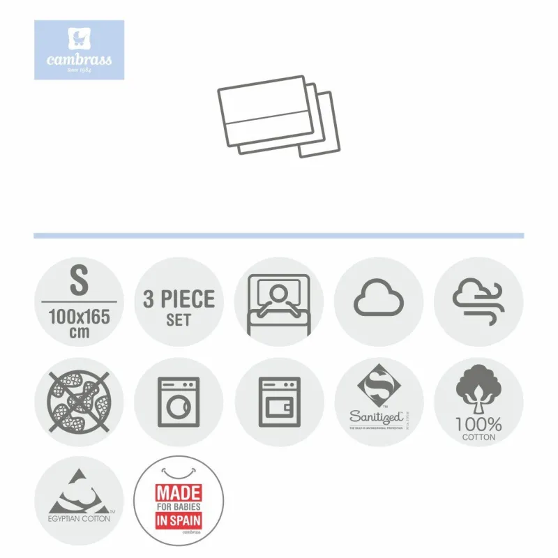 La Sábana cuna 3 piezas pará cuna de 60x120 cm. de Cambrass es de algodón egipcio 100% lo que le aporta un tacto suave. El set está compuesto de sábana encimera, sábana bajera y funda para almohada.