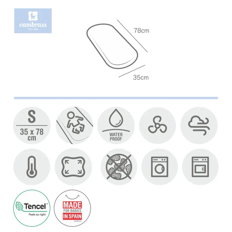 La sábana ajustable confeccionada con fibras de TENCEL ™ es impermeable y transpirable (para capazo o carro) de Cambrass, funciona como una práctica bajera. Fabricado en España. Por Cambrass.