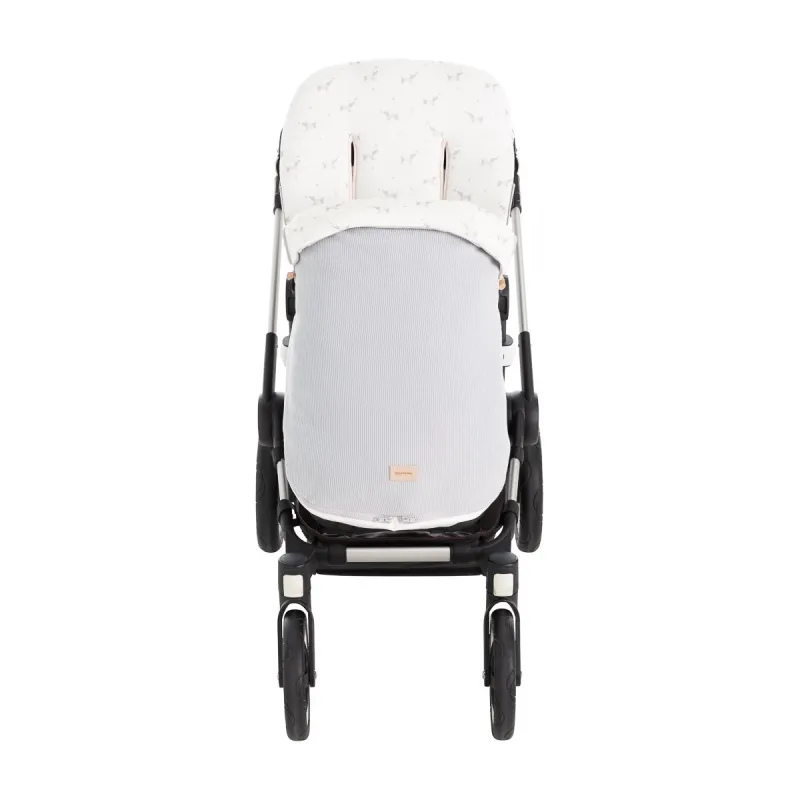Funda de silla para bebé Mimosa de Walking Mum, fabricada con tejido de 100% algodón. Ideal para cubrir la base de la silla de paseo y viene provista de saco para arropar a tu bebé. Trasera con material...