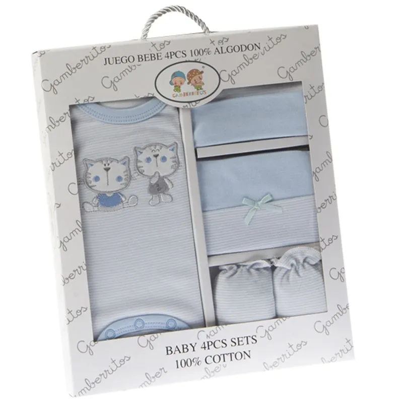Conjunto infantil fabricado en algodón compuesto por pelele, babero, gorro y manoplas.