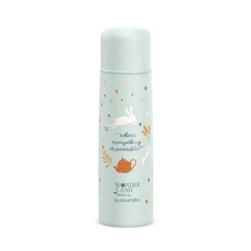 El Termo Para Líquidos Wonderland Liberty - Azul de Suavinex es ideal para transportar líquidos calientes y fríos, manteniendo su temperatura durante horas. Con una capacidad de 500 ml, su sistema de cierre por pulsación es totalmente hermético, y su interior de 100% acero inoxidable no retiene sabores ni olores. El exterior permanece frío al tacto incluso con líquidos calientes.