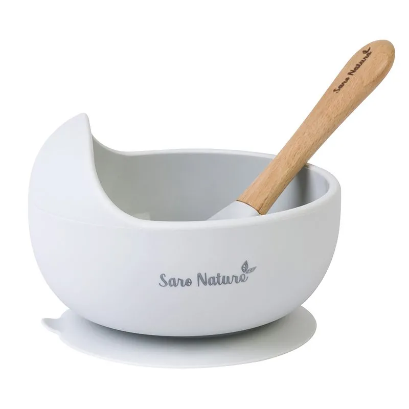 • Un cuenco de silicona con una práctica ventosa en su base que lo fija a la mesa. ¡A prueba de bebés rebeldes!