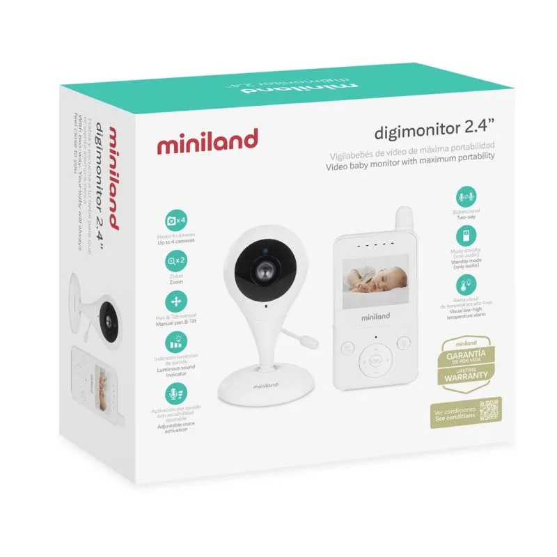 El Vigilabebés Digimonitor 2.4 de Miniland es un dispositivo compacto y portátil con un alcance de 250 metros. Ofrece funciones de activación por sonido, comunicación bidireccional, control de temperatura, indicador luminoso de nivel de sonido y capacidad de conectar hasta 4 cámaras. Con más de 50 años de experiencia, Miniland es una marca confiable para los padres.